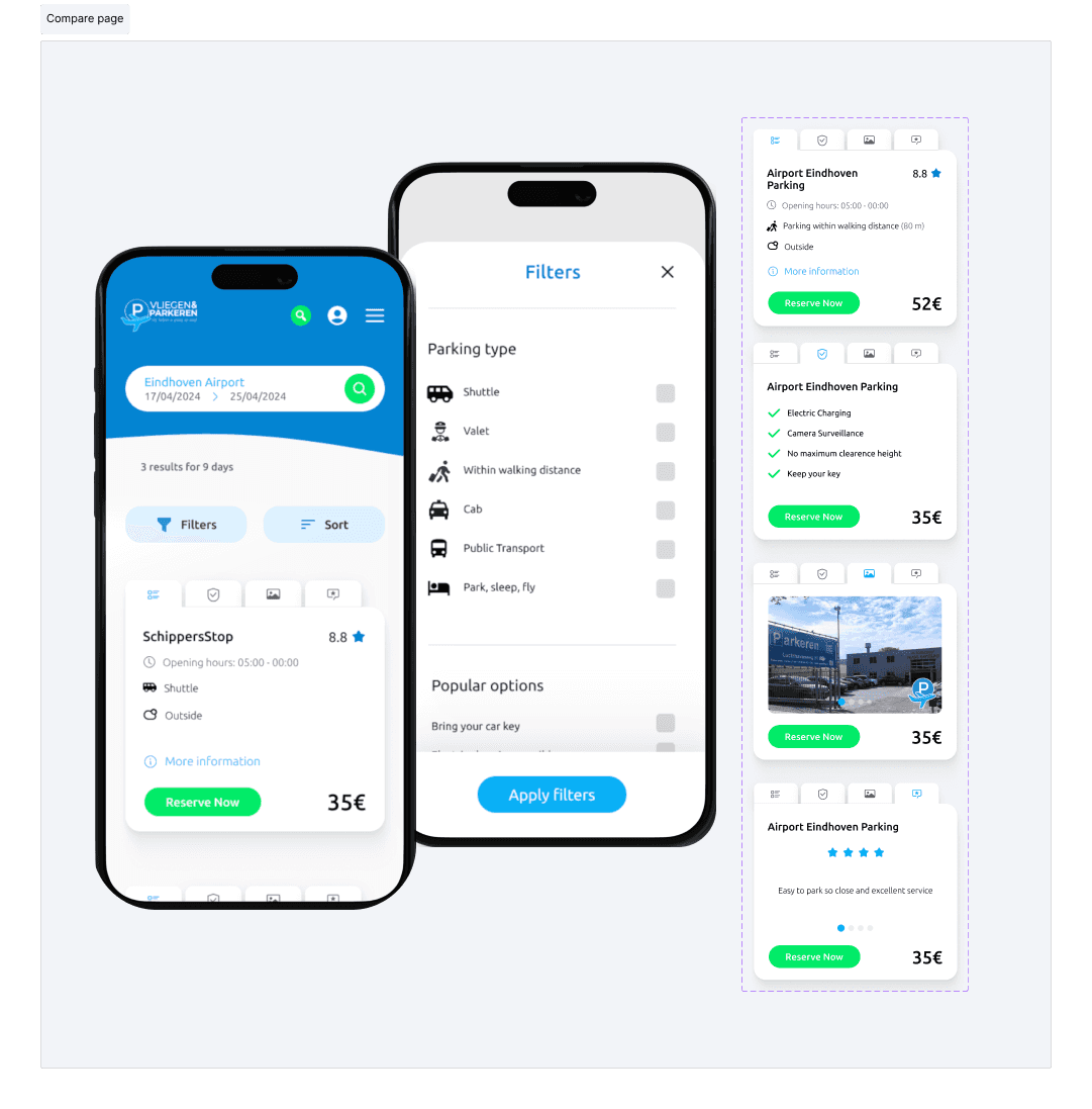 A new parking lot information card was designed using tabbed sections (e.g., General, Reviews, Facilities) to allow users to quickly access key information without accessing the detailed page. Based on competitor analysis, this structured overview was not previously implemented in the industry and aimed to improve clarity and decision-making efficiency.